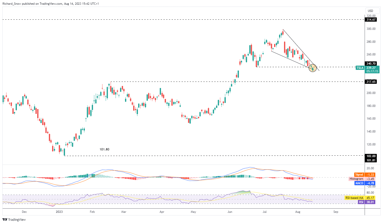 S&P 500, NASDAQ ANALYSIS US indices off to a slow start – Tesla down after Chinese vehicle discounts US PPI, Treasury yields and the US dollar weigh on US stocks The analysis in this article makes use of chart patterns and key support and resistance levels. US INDICES OFF TO A SLOW START – TESLA DOWN AFTER CHINA VEHICLE REPRICING Tesla announced it was cutting prices of its popular Model Y offering in the competitive Chinese market for electric vehicles. The move has been prompted by a tricky trading environment, as the Chinese economy faces a number of challenges to the highly anticipated economic rebound. Economic data since Q1 has placed the recovery in doubt. The manufacturing sector continues to contract, exports and imports declined in July and according to the latest inflation report, deflation appears to be setting in. Tesla gapped lower at the start of trading but has attempted to bridge the gap since. The June swing low will be telling as it serves as a tripwire for potential continued selling. Tesla Daily Chart Source: TradingView, prepared by Richard Snow US PPI, TREASURY YIELDS AND THE DOLLAR WEIGH ON US STOCKS Friday’s hotter than expected PPI print resulted in further rising US 10-year yields which supports the US dollar. Such a result typically weighs on indices as rising risk-free rates carry a more attractive yield and, as the name suggest, its as close to risk free as you can get. US 10-year yields approach levels last seen at the end of October – the highest since 2007/2008. A lack of high importance US data this week leaves US indices looking for direction. One thing markets will get clarity on this week is the state of the US consumer, with US retail sales data and earnings updates from Target and Walmart. The S&P 500 recently broke below trendline support – highlighting the potential for an extended pullback. The June 16th high at 4450 appears to have provided a level of support as price action now tests the trendline resistance (former support). The MACD highlights the bearish momentum which remains in play, resulting in renewed interest in trendline resistance. If broken with momentum, 4450 is followed by 4325 on the downside. A move and close above trendline resistance highlights the yearly high of 4607. S&P 500 Daily Chart Source: TradingView, prepared by Richard Snow NASDAQ 100 BREAKS TRENDLINE SUPPORT The Nasdaq (E-Mini Futures) chart reveals a very similar charting posture, although, only on Friday witnessed a break of trendline support. 14,853 is the tripwire for bearish momentum with 14,251 coming into focus thereafter. Tech stocks however, have been resilient in 2023 despite interest rates rising above 5%. As such, the outlook remains in favor of the uptrend. 15,260 is the immediate level of resistance followed by 15,710 and 16,062. Nasdaq 100 Daily Chart (E-Mini Futures) https://www.dailyfx.com/news/s-p-500-nasdaq-update-us-stocks-resilient-despite-tesla-s-china-woes-20230814.html