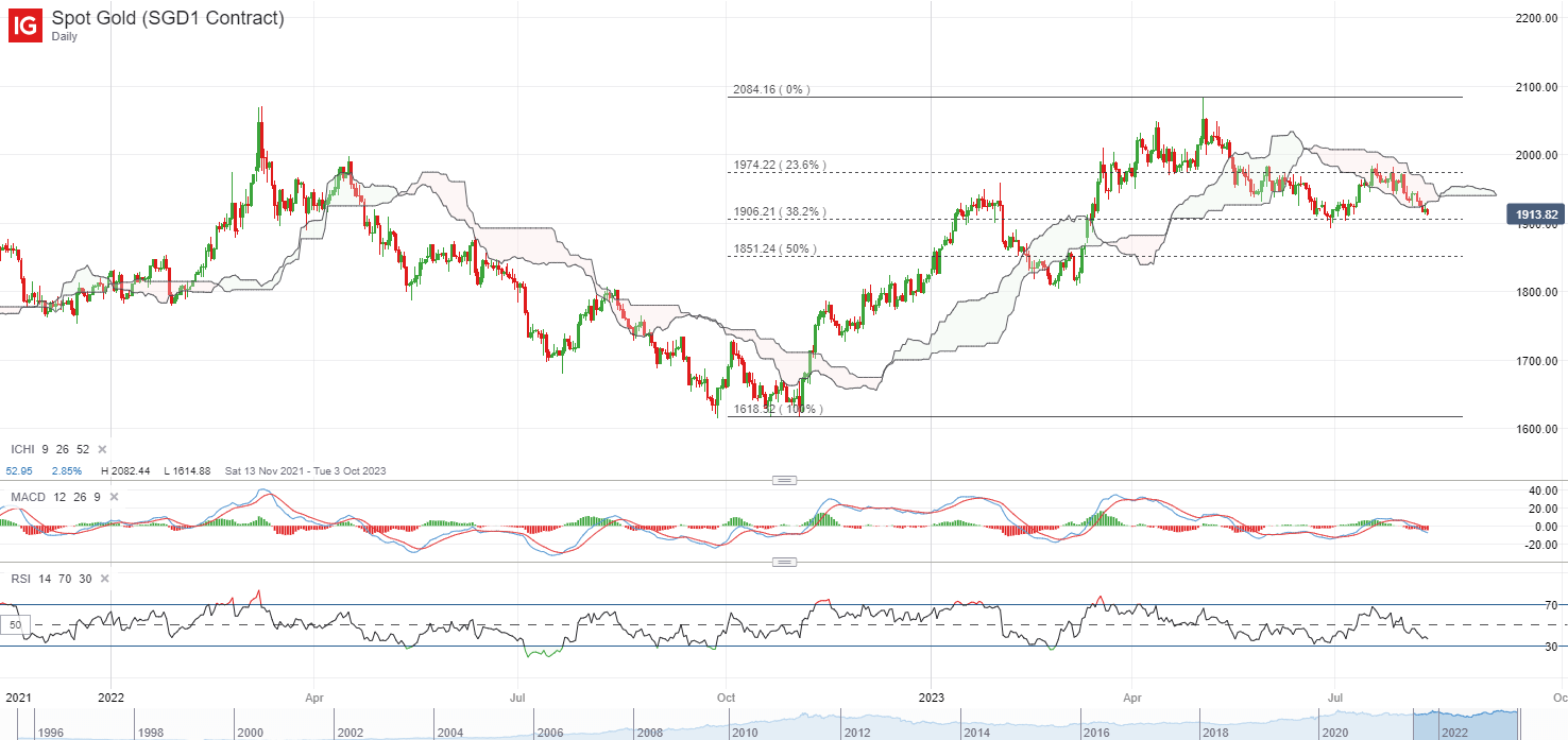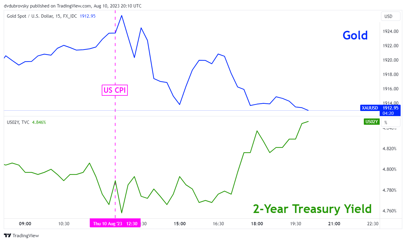 GOLD, XAU/USD, CPI, TRENDLINE BREAKOUT – PRECIOUS METALS BRIEFING: Gold prices sink in the aftermath of US inflation data Longer-term Treasury yields outpaced the front-end This will continue making life difficult for XAU/USD Gold prices weakened in the aftermath of US inflation data on Thursday, reversing upside progress accumulated during the first 12 hours of the day. Headline CPI clocked in at 3.2% y/y in July against the 3.3% consensus, which was a little softer. But, it marked an uptick from last month’s 3% outcome. Meanwhile, the core gauge weakened slightly to 4.7% y/y from 4.8%, as expected. Treasury yields aimed higher as well – see chart below. A closer look at Federal Reserve monetary policy expectations reveals that while the report did little to alter near-term interest rate bets, the broader horizon looks a little bit different. The 3+ year horizon added the most tightening, which speaks to a central bank that is hawkish for longer. During the past 24 hours, San Francisco Fed President Mary Daly mentioned that the central bank still has “more work to do”. As such, it is unsurprising to have seen longer-term Treasury rates rally the most as it reflects financial markets increasingly looking at a central bank that delays the next rate cut cycle. Gold, being the anti-fiat instrument, unsurprisingly did not fare well. Gold and Treasury Yields After US CPI Data Gold Technical Analysis These developments are leaving the yellow metal in a precarious state heading into the final 24 hours of this week. On the daily chart below, gold appears to be confirming a breakout under a rising trendline from February. From here, immediate support is the 38.2% Fibonacci retracement level at 1903. Pushing below this price opens the door to an increasingly bearish technical bias. XAU/USD Daily Chart https://www.dailyfx.com/news/gold-price-outlook-at-risk-as-markets-embrace-tighter-fed-for-longer-after-us-cpi-20230810.html