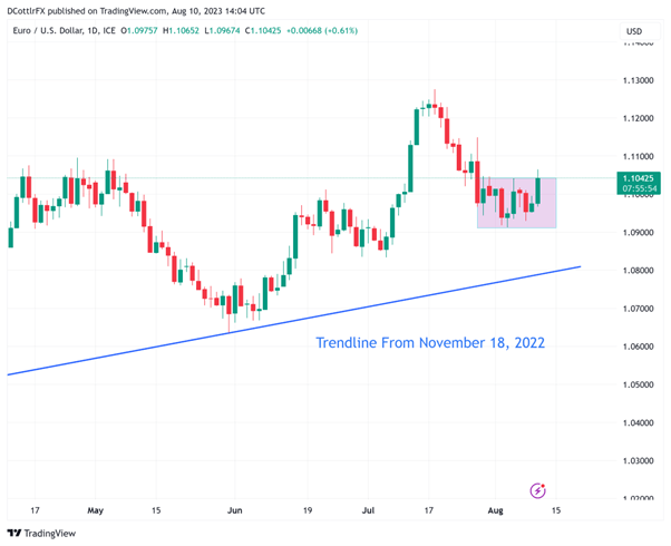 EUR/USD PRICE, CHART, AND ANALYSIS EUR/USD topped 1.10 After Jul’s US Inflation Data Core CPI’s Deceleration Trend Remains In Place even as headline inflation ticked up Eurozone inflation expectations remain uncomfortably high The Euro popped above its last ten days’ trading range against the United States Dollar in Thursday’s European afternoon as important US inflation data came in broadly as expected, with markets reportedly daring to hope that interest rates might not have to rise again this year in the world’s largest economy. July’s official Consumer Price Index rose by an annualized 3.2%. That was above June’s 3% rise. Food, housing, and automobile insurance costs were largely to blame for the increase. The core measure strips out the volatile effects of food and fuel. It rose by 4.7%. That was a tick below June’s outcome. The rate has been gradually weakening since it peaked at 6.6% back in September 2022. Headline inflation meanwhile peaked at 9.1%. A good session for market forecasters, then, but a rather less good one for Dollar bulls. EUR/USD popped above $1.10 on the news, as markets stick with the view that, while US borrowing costs may have further to rise, they’re not likely to go too much higher in this cycle given clear signs that inflation is coming to heel. Indeed, the Wall Street Journal reported after the data that derivatives markets now predict that the current Fed Funds Target Rate of between 5.2%% and 5.5% is likely to stay put for the rest of this year. Of course, this thesis will be highly data dependent and there’s one more CPI report and another official employment data release between now and the next meeting of Open Market Committee rate-setters on September 20. The Euro has slipped against the greenback since it printed seventeen-month highs in mid-July, but it hasn’t fallen very far despite a rather gloomy outlook for the Eurozone economy. The European Central Bank released its monthly bulletin this week. It was a downbeat roundup that spoke of a deteriorating economic outlook and weaker domestic demand thanks to rising inflation and tight financing conditions. Inflation expectations within the currency bloc remain uncomfortably high, despite the ECB itself hinting that it might be close to the end of its own tightening cycle after nine consecutive increases in borrowing costs. Still, the Euro retains a degree of interest rate support which has seen EUR/USD climb steadily from its lows of last September. The week hasn’t got a lot more to give in terms of tradable economic numbers. Friday’s Yuan-loan data out of China could move EUR/USD given the market focus on China’s stuttering recovery. The University of Michigan’s venerable consumer sentiment snapshot will round out the week. EUR/USD Technical Analysis EUR/USD Daily Chart Compiled Using TradingView EUR/USD has been rangebound since July 26 between 1.0909 and 1.1041. Thursday’s trade has seen the pair probe above that but the break doesn’t at this point look conclusive. Euro bulls will need to retake July 6’s peak of 1.1103 to convince and, perhaps, push on to key resistance at 1.1275, but so far they haven’t had the conviction to do so. Near-term support comes in at 1.0912 and 1.07329, with the latter below trendline support from last November which comes in at 1.07905. Longer-term, the Euro remains well within the impressive uptrend established since last September’s lows and seems likely to retest its recent highs once the present consolidative phase plays out. Sentiment toward the pair is bullish according to IG Group data, although not overly so, and the uncommitted may want to wait and see where the pair closes out the week relative to its current trading range before taking a directional view. https://www.dailyfx.com/news/eur-usd-gains-on-target-us-cpi-has-markets-betting-rates-will-stay-put-20230810.html