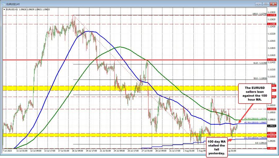 Stay below keeps the seller in play EURUSD stalls against the 100 hour MA The EURUSD moved modestly higher in the early trading for the day and reached up to the 100-hour MA at 1.09687. Sellers leaned against the level keeping the sellers in play. The price is modestly off the level at 1.0963 currently. On the downside, remember, the price yesterday moved down toward the 100-day MA yesterday and found early buyers. Last week, the 100-day MA was tested on Wednesday and Thursday. So the 100-hour MA above, and the 100-day MA below continue to define the range for the EURUSD. Still waiting for the break outside one of those MA levels. https://www.forexlive.com/technical-analysis/eurusd-sellers-lean-on-the-test-of-the-100-hour-ma-20230809/