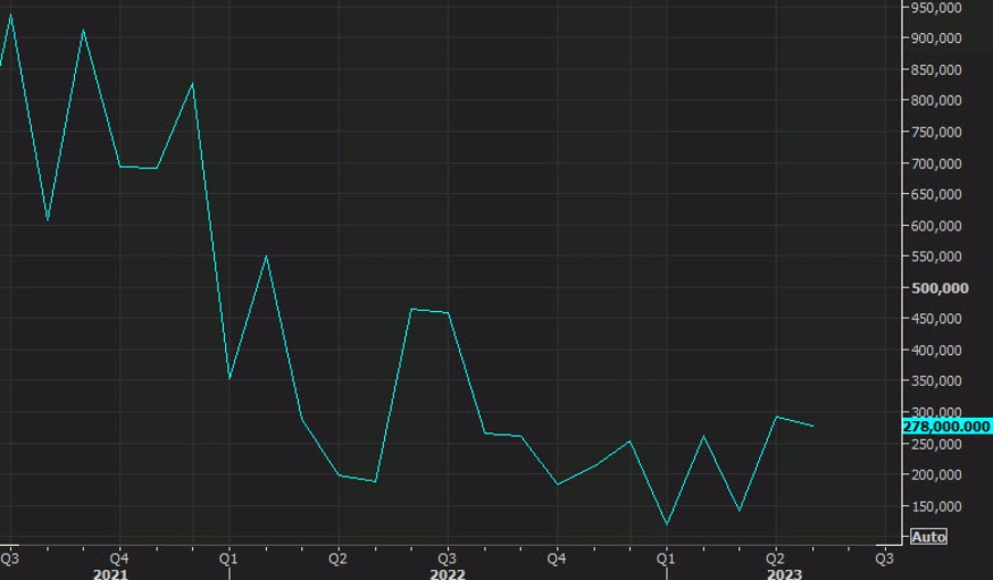 The June 2023 employment reading from ADP ADP employment Largest since Feb 2022 Prior was 278K Details: small (less than 50 employees) +299K vs +116K prior medium firms (500 – 499) +183K vs +112K prior large (greater than 499 employees) -8K vs +106K prior Job stayers 6.4% vs 6.5% Job changers 11.2% vs 12.1% The US 2-year yield topped 5% for the first time since early March on the data and the US dollar is stronger across the board. The high for the year is 5.08%. “Consumer-facing service industries had a strong June, aligning to push job creation higher than expected,” said Nela Richardson, chief economist, ADP. “But wage growth continues to ebb in these same industries, and hiring likely is cresting after a late-cycle surge." In the breakdown, the leisure/hospitality industry added 232K of the jobs with education/health services adding another 74K. Construction was also strong at +97K. https://www.forexlive.com/news/us-june-adp-employment-497k-vs-228k-expected-20230706/