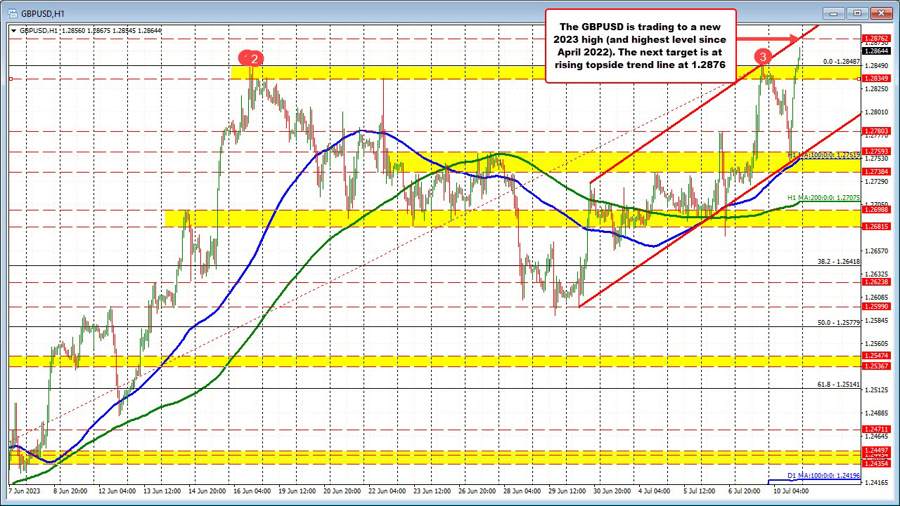 The next target is at 1.2932 area GBPUSD trades to new 2023 high The momentum has continued for the GBPUSD. It has now broken above the June and July highs near 1.2848. The price is currently trading at 1.28655. That takes the price to the highest level since April 22, 2022 Looking at the hourly chart above, the next Topside target comes against a trendline connecting recent highs that cut across at 1.28762 (and moving higher). A move above that level increases the bullish bias. Looking at the daily chart below, there is a topside trendline connecting highs from April 4, May 8, and June 16. (See red numbered circles on the chart below). That trendline currently cuts across around 1.2932. Above that and a swing area going back to March and April 2022 cut across between 1.2971 and 1.29987 (see green number circles). GBPUSD trades to highest level since April 2022 https://www.forexlive.com/technical-analysis/gbpusd-trades-to-a-new-2023-high-and-the-highest-level-since-april-2022-20230710/