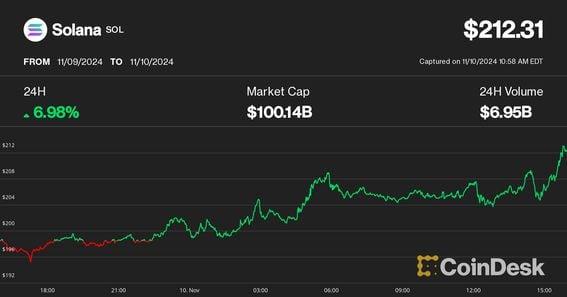 The fourth largest crypto could potentially reach its 2021 record high of $260 in the coming days given its relative strength through crypto's eight-month long consolidation phase, one analyst noted. Solana's native cryptocurrency (SOL) hit a new milestone on Sunday as bitcoin's (BTC) breakout to new record prices accelerated the broad-based crypto rally following Donald Trump's decisive election victory and the Federal Reserve's additional rate cut. SOL broke above its March-April cycle highs touching $212 for the first time since the 2021 crypto bull market peak. The token has gained 34% over the week, leading BTC's 18% move and the broad-market CoinDesk 20 Index's 27% advances. SOL's all-time record was $260, or just a bit more than 20% above the current price of $214. This week's gains catapulted SOL to more than a $100 billion market capitalization, joining only three other cryptocurrencies with much longer history above that threshold: bitcoin, of course, leading layer-1 smart contract platform Ethereum's ether (ETH) and dominant stablecoin tether (USDT). The "flippening" chatter has returned to crypto twitter, though this time around it's the idea that SOL's market cap might at some point top that of ETH, which currently sits at about $389 billion. Solana achieved a remarkable comeback after the collapse of Sam Bankman-Fried's FTX and Alameda Research in 2022, which was a key backer of the budding smart contract platform. The chain emerged as the go-to ecosystem for retail crypto users and a hotbed of this cycle's memecoin craze, hosting for example the popular pump.fun protocol. Resurging decentralized finance (DeFi) activity also benefitted the network, making Solana's on-chain trading ecosystem the third-most-profitable sector in crypto, a recent Coinbase report noted. The solana token was a standout among altcoins over the past year's mostly bitcoin-dominated bull market, appreciating 275% year-over-year. Solana's milestone has broader implications for the crypto market, noted Julien Bittel, head of macro research at Global Macro Investor. SOL broke out from an eighth-month sideways consolidation channel, suggesting that the broader crypto bull market may have entered the most explosive phase, often referred as the "banana zone" for its near-vertical rally. "We officially just started the next phase of the bull market," well-followed cross-asset trader Bob Loukas said in a Sunday X post. In an earlier post, he forecasted that SOL could achieve its previous all-time high price in the coming weeks given its strength relative to the rest of the market. "SOL to ATH within 14 days wouldn't be a surprise now," he said on Tuesday. "This one could get silly in 2025." https://www.coindesk.com/markets/2024/11/10/solana-joins-100b-club-hitting-nearly-a-three-year-high-above-210/