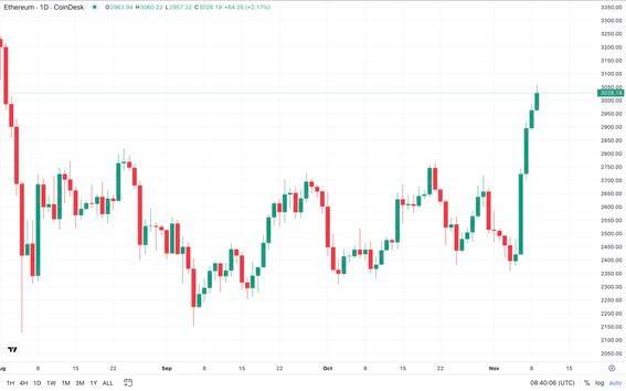 ETH is on track to register its biggest weekly since May, but remains well below its record high. ETH jumps to highest since Aug. 2. Hopes for regulatory relief under the Trump presidency and Fed rate cuts galvanize demand for ETH. When a beleaguered asset is met with a burst of good news, it can unleash powerful bullish momentum, often outshining the broader market. Ethereum's native token, Ether (ETH), is experiencing this phenomenon following pro-crypto Donald Trump's victory in the U.S. election and the Fed rate cut earlier this week. ETH, the world's second-largest cryptocurrency by market value, surged past $3,000 on Saturday, reaching the highest since Aug. 2, according to CoinDesk data. Prices have risen 23.39% this week, the biggest gain since May, outperforming BTC's 11.2% gain by a significant margin. The total crypto market capitalization has increased by 13.5% to $2.5 trillion. ETH's market-beating surge could be attributed to two factors. First, there is hope that the Trump administration will relax regulatory barriers for the digital assets industry, potentially fostering growth in decentralized finance, a sector dominated by Ethereum. Another equally important factor is the Fed rate cut cycle, which is restoring ether's appeal as an internet bond, offering a fixed-income return through staking rewards. On Thursday, the Fed reduced the benchmark borrowing cost by 25 basis points to a range of 4.5%-4.75%, having delivered an outsized 50 bps cut in September. The rate reduction has narrowed the so-called Fed-ether yield differential in favor of ETH. The way ether options listed on Deribit are currently priced suggests the ETH rally is expected to continue. The call-put skew is positive across time frames, indicating a relative richness of call options offering asymmetric upside potential to the buyer. Inflows into the spot ether exchange-traded funds (ETFs) have picked up as well. On Friday, BlackRock’s iShares Ethereum Trust ETF (ETHA) registered an inflow of nearly $60 million, the highest in three months, according to Farside Investors. Note that ETH is still well below its 2021 peak of $4,868, while BTC is trading at record highs above $75,000. https://www.coindesk.com/markets/2024/11/09/ether-blows-past-3k-builds-bullish-momentum-after-trumps-election-win-and-fed-rate-cut/