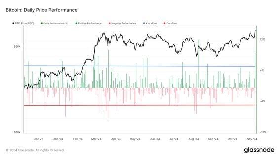 BlackRock's iShares Bitcoin Trust registered $4.1 billion in volume traded as bitcoin broke out to all-time highs. Bitcoin rose more than 9% on Wednesday to claim a record high. BlackRock's IBIT exchange-traded fund saw its biggest volume traded since its introduction. U.S. spot-listed bitcoin ETFs saw over $620 million of net inflows. Bitcoin (BTC) posted its fourth-best day of the year on Wednesday following the U.S. presidential election victory of Donald Trump, who voiced support for the crypto industry during his campaign. The largest cryptocurrency by market value climbed more than 9% to hit a record $76,481, CoinDesk Indices data show. It hit 9.7% at the end of February, during a rally that took it to the previous high in March, gained 10% after dropping from that high and added 12% after the Aug. 5 yen carry trade unwind. While Wednesday's swing may concern investors who think the gain is unsustainable, earlier research indicated BTC could rise 11% on a Trump victory. Bitcoin ETF inflows The rally coincided with massive inflows into spot bitcoin exchange-traded funds (ETFs), which added a net $621.9 million, according to Farside data. The flow, one of the highest figures since the products' introduction in January, snapped a three-day streak of outflows. Total net inflows have now reached $24.2 billion. Among notable performances, Grayscale's Bitcoin Mini Trust (BTC) registered $108.8 million, its second-biggest day since the start of trading. Bitwise Bitcoin ETF (BITB) saw a $100.9 million inflow, also one of its biggest net inflow days. BlackRock's iShares Bitcoin Trust (IBIT), in contrast, posted a second-straight day of net outflows, losing a total of $113.3 million over the period. Trading volume in the ETF was at a record level, according to Senior Bloomberg ETF analyst Eric Balchunas. "IBIT just had its biggest volume day ever with $4.1b traded," Balchunas wrote. "That's more volume than stocks like Berkshire, Netflix, or Visa saw today. It was also up 10%, its second-best day since launching, some of this will convert into inflows". Overall, "the group of bitcoin ETFs did $6b, their best day since the crazy early days. Most of the ETFs did 2x their average. It was just an all-around banger day for an infant category that never ceases to amaze," he wrote. To provide some historical context, ETF trade volume reached a $9.9 billion peak during the March bull run, according to data from checkonchain. Total trade volume on Nov. 6 reached approximately $76 billion, comprising futures volume of $62 billion, spot volume of $8 billion and ETF trade volume of $6 billion, so ETF trade volume is still a small percentage of the total. Ether (ETH) is lagging behind bitcoin's 2024 performance. Net inflows into ether U.S. spot ETFs totaled $52.3 million, the most since Sept. 27, according to Farside data. As of press time, bitcoin is trading at just over $75,000, up 77% year-to-date, while ether is trading at $2,822, up 20% year-to-date. https://www.coindesk.com/markets/2024/11/07/bitcoin-registers-fourth-best-day-of-2024-as-blackrock-etf-posts-record-volume/