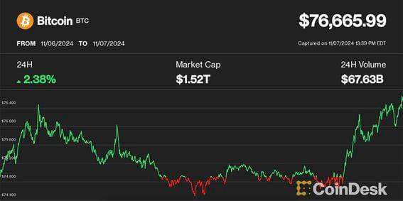 Bitcoin (BTC) just hit a new all-time high, but Ethereum's ether (ETH) is the bigger winner. Bitcoin has made a new all-time high, continuing its strong performance after Donald Trump won the U.S. presidential election. Ether outperformed by rising 8% in the last 24 hours ahead of Federal Reserve policymakers' meeting. Bitcoin (BTC) just made a new all-time high, continuing its powerful advance following Donald Trump's election victory. The top cryptocurrency is currently up 2.3% in the last 24 hours and trading for $76,600, buoyed by former President Trump's win, as well as market expectations that the Federal Reserve will announce a 0.25% federal interest rate cut after Thursday's Federal Open Market Committee meeting. It's been less than a day since bitcoin notched its last all-time high of $76,480 — a price that broke a seven-month-old record. It's not the only coin doing well. The CoinDesk 20 — an index of the top 20 cryptocurrencies by market capitalization, excluding stablecoins, exchange tokens and memecoins — is up 4.3% in the last 24 hours. Surprisingly, Ethereum's ether (ETH) has proved to be one of the index's best performers. The largest smart contract platform has surged 8% and is now priced at almost $2,870 — showing signs of breaking away from the $2,800 to $2,300 range where it's been stuck. "Beyond ... bitcoin pushing to a fresh record high, the market should perhaps be paying attention to what could be a more bullish development," Joel Kruger, market strategist at LMAX Group, said in a Thursday market update. "The crypto market is looking for a resurgence in the decentralized finance space, with Ethereum playing an important part in this initiative." "Now that BTC has finally pushed through $75,000 and ETH has broken back above $2,800 the stage is set for what could be a strong close to 2024 and bright outlook in 2025," he added. Other winners: Cardano's ADA is up 10.4%, while Polygon's POL has risen 6.6% so far. Solana (SOL) also keeps inching toward new highs. Now up 5%, the coin is trading for $195 and is only 33% away from its 2021 all-time high. On the equities side, bitcoin mining firm Core Scientific (CORZ) has surged more than 11% on the day after a Wednesday earnings call revealed the company was executing on its artificial intelligence ambitions. Meanwhile, MicroStrategy's (MSTR) 5.8% gain has taken it to a new 20-year high. Coinbase (COIN) is taking a breather after blasting upwards 31% Wednesday, and is only up 1.1%. The price action happened before an FOMC decision that could shake up digital asset markets. The Fed is widely anticipated to lower interest rates by 25 basis points, but Fed Chair Jerome Powell's press conference on policy and inflation for the first time since Trump won the election could induce volatility. https://www.coindesk.com/markets/2024/11/07/post-election-deja-vu-bitcoin-spikes-to-a-new-record-high-while-ether-and-solana-rally-ahead-of-fomc/
