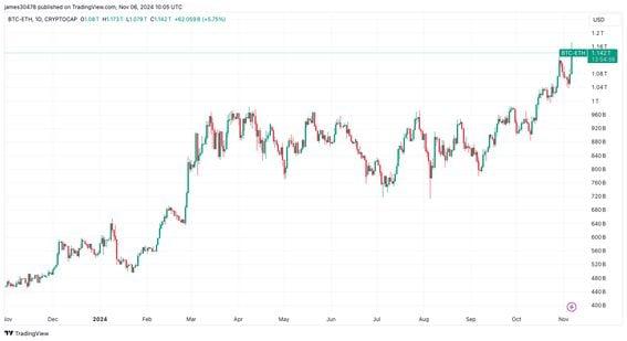 Bitcoin dominance approached 61% with Solana dominance also primed to touch record high. Bitcoin broke all-time highs on Donald Trump winning the U.S. presidential election. Solana continues to outperform ether, making a new cycle high. The total cryptocurrency market cap hit $2.45 trillion, the most since June. Bitcoin (BTC) surged to an all-time high above $75,000 as Republican Donald Trump looked set to clinch the U.S. presidency. It was recently trading around $74,000 on major crypto exchanges. The election result was the news bitcoin needed to break through March's record, and the U.S. market's opening could propel the largest token by market cap to even greater heights. Crypto was one of the biggest winning industries on the Trump triumph, with total market capitalization hitting $2.45 trillion, the highest since June, according to the TradingView metric TOTAL. ETH/BTC ratio slumps The widely watched ratio tracking the relative price strength of ether (ETH) against bitcoin dropped to its lowest level since April 2021, suggesting a fallout in investor demand for the world’s second-largest token. The ether-bitcoin trading pair fell under 0.035 early Wednesday, extending year-to-date losses to more than 34%. Although colloquially called a ratio, ETH/BTC is simply the trading pair of ether against bitcoin on crypto exchanges, which attracts hundreds of millions in daily volumes. An increase indicates that ether is outperforming bitcoin and vice versa. When the price rises, traders consider a preference for ETH beneficial for riskier assets and Ethereum ecosystem bets. A slide indicates a preference for Bitcoin and blockchains other than Ethereum. Over the past five years, the ratio has risen from 0.02 to a peak of above 0.08 in early 2022, meaning ETH quadrupled in value relative to BTC at the time. Since then, it's been on decline. Even as BTC set a lifetime high, ether has yet to break through its high from 2021 and is down 46% from its peak. Year-to-date, bitcoin has returned over 75% to investors, while ether holders have gained just over 14%, according to MarketWatch data. In addition, bitcoin's market cap approached $1.5 trillion at the high and continues to widen and outperform ether. The spread between bitcoin and ether's market cap hit a new high of $1.16 trillion, which coincided with the ETH/BTC ratio continuing to make new lows. Solana's another big winner Solana (SOL) also flexed its muscles against ether. The token is up 10% in the past 24 hours, and also made new cycle highs against ether at 0.072. The Solana market cap dominance approached 3.70%, though it has yet to break into new all-time highs. Profit-taking continues Bitcoin has been climbing higher throughout September, October and into November. CoinDesk research has observed a lot of profit-taking over the past month. As bitcoin made new all-time highs, CoinDesk observed a notable amount of profit-taking, $1.5 billion worth, which coincided with bitcoin's slight pullback from all-time highs. https://www.coindesk.com/markets/2024/11/06/bitcoin-solana-hit-new-cycle-highs-against-ether-as-trump-edges-closer-to-us-presidency/