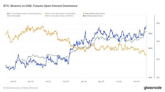 Bitcoin has added $30,000 since Donald Trump won the U.S. presidential election and closing in on a $2 trillion market cap. Bitcoin futures open interest on the CME exchange has hit 218,000 BTC ($21.3 billion). The cryptocurrency's market cap is closing in on a historic $2 trillion. CME growth is largely coming from active and direct participants, K33 research says. Bitcoin (BTC), the largest token by market capitalization, is approaching a $2 trillion market cap for the first time after its price added $30,000 since Donald Trump won the U.S. presidential election at the beginning of the month. Currently at $1.93 trillion, a price of about $101,000 per bitcoin would achieve this landmark. The BTC price crossed $97,000 for the first earlier Thursday, and its market dominance reached a high of just below 61.8%. According to Coinglass data, bitcoin futures open interest (OI) on the Chicago Mercantile Exchange (CME) hit a record 218,000 BTC ($21.3 billion), more than a third higher than before the Nov. 5 election. Rising open interest when prices are also ratcheting higher is a sign of bullish sentiment in the market. "The relentless surge in CME open interest shows no sign of stopping; back-to-back all-time highs," Velte Lunde, head of research at K33, wrote in a post on X. "To contextualize, the growth in CME OI over the past 15 days is larger than the average notional open interest on CME in any year before 2022." Lunde noted that active and direct market participants are behind the rally. This cohort engages directly with the futures market, whereas other growth could have come from futures-based exchange-traded funds (ETFs) such as the ProShare Bitcoin ETF (BITO), as CoinDesk reported last month. The introduction of options tied to U.S. spot ETFs should also help CME futures grow. "CME open interest crosses 200k BTC, with active market participants continuing to be the force moving exposure higher. Expect CME futures to continue to thrive with the launch of ETF options", Lunde wrote. Volatility should decrease over time The larger bitcoin's role and the more intertwined it becomes with the traditional financial (TradFi) system, the more likely volatility will decline over time. We have seen this over the past few years, as realized volatility has decreased from over 100% to approximately 40%, according to Glassnode data. Cash-margin contracts are also at an all-time high. These contracts use stablecoins or U.S. dollars as the underlying collateral and are inherently not volatile. That's in contrast with crypto collateral, which is volatile by nature. CME uses only cash margin for futures open interest, while retail-focused exchanges such as Binance are prepared to accept crypto margin. Glassnode data shows that the CME dominates the futures open interest market by 33%, a margin that is still growing. Glassnode data also shows that the percentage of futures contracts that are margined in crypto and not in cash is at an all-time low of just 16%. The lower the number, the less volatility we should see in the bitcoin price. https://www.coindesk.com/markets/2024/11/21/futures-open-interest-on-cme-surpasses-215k-bitcoin-for-the-first-time-as-btc-eyes-100k/