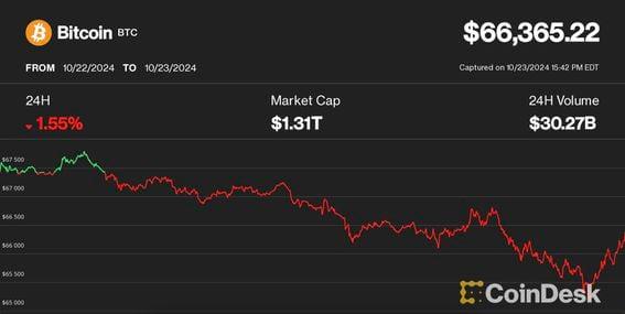 Cryptocurrencies weren't spared as stocks, bonds, gold and oil all declined on Wednesday. Cryptocurrencies fell today alongside the broader stock market. Among major tokens, ether fared particularly poorly, falling 5%. SOL/ETH notched a new all-time high, while ETH/BTC made new lows. Cryptocurrencies bled lower on Wednesday alongside a slide in traditional markets across the board. The CoinDesk 20 – an index of the top 20 cryptocurrencies by market capitalization, excluding stablecoins and exchange coins – was down 2.6% in the last 24 hours, with Chainlink (LINK) the worst performing, slumping 7.6%. The only project to buck the downtrend was Internet Computer (ICP), which rose 1% Bitcoin (BTC) dipped 2.3% to $66,000, while ether (ETH) tumbled 5.3%, taking its price back under $2,490. Solana (SOL), meanwhile, showed further strength today – at press time, the coin was flat at $169. ETH not only made new lows against BTC – the ETH/BTC ratio went below 0.038 for the first time since April 2021 – but also against SOL. The SOL/ETH trading pair notched a decisive new all-time high by rising 6.3% to 0.068 amid renewed debate in the crypto community about the wisdom behind Ethereum’s roadmap. “Much of the poor sentiment and questions around Ethereum's roadmap is due to recent underperformance versus BTC and SOL,” Brian Rudick, director of research at crypto trading firm GSR, posted on X. “However, this is a poor comparison as BTC and SOL were subject to two large idiosyncratic events,” Rudick wrote, namely, the immense success of the spot bitcoin exchange-traded funds, and the impact of the FTX collapse – and Solana’s resurgence from the ashes – on investor perception. “Measuring from crypto's ATH market cap in Nov 2021 to remove [the FTX collapse] shows ETH and SOL have had [about] the same performance,” Rudick added. The looming U.S. election, only two weeks away, didn't appear to offer any assistance either. Even with crypto-friendly Donald Trump in the lead (based on betting markets), and Vice President Kamala Harris appearing less adversarial towards crypto than the current administration, markets will have difficulty “breaking upwards before election day,” Joe Edwards, head of research at digital assets broker Enigma Securities, wrote in a research report. Broader market uncertainty The bleeding out Wednesday wasn’t contained to crypto. The S&P 500, Nasdaq, and Dow Jones were each lower by more than 1% shortly before the end of the session as price consolidated following strong runs higher for all over the past couple of months. The bond market was also lower, with the 10-year Treasury yield rising to a three-month high of 4.25%. Making record highs on seemingly a daily basis of late, gold also pulled back, slipping 1.1% to $2,730 per ounce. The price of oil fell 1.35% to $70.77 per barrel. “Don’t worry folks Tesla will save the market when they report earnings,” Ram Ahluwalia, CEO of crypto investment advisor Lumida Wealth, posted on X. “Overall, I’d say we are closer to the end of this move of pricing in higher for longer… November is looking very good in my view.” Tesla is due to report its quarterly results after this afternoon's market close. Crypto equities felt the brunt of the pullback. Bitcoin miners fared the worst, with MARA Holdings (MARA) and CleanSpark (CLSK) each lower by about 5%. Coinbase (COIN) slumped 6% and MicroStrategy (MSTR) slipped 2.5%. https://www.coindesk.com/markets/2024/10/23/bitcoin-slides-to-66k-ether-dives-5-in-market-wide-selloff/
