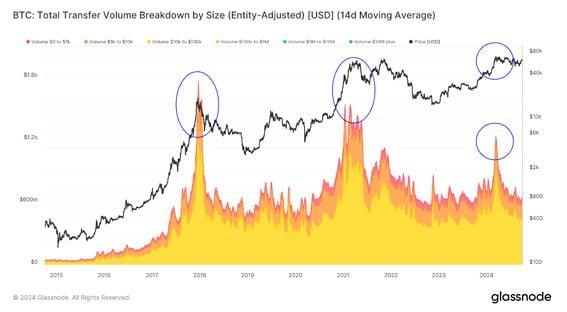 Big upticks in retail interest are commonly thought to be a topping indicator, so the current relative lack of involvement could hint at potential further price increases. In previous crypto bull markets in 2017 and 2021, the Coinbase app was ranked number one in downloads versus the current 438. The amount of bitcoin owned by short-term holders is approximately 2.5 million tokens, a level typically associated with bear markets. NFT- related gas usage on the ether network has fallen to 2%, down significantly from its peak of around 40% in 2021. One of the biggest questions in the crypto industry is whether retail is participating in this current rally. Retail entrance often marks a sign of euphoria or greed and, in some cases, is thought to be a leading indicator of a top in the market. With bitcoin (BTC) gaining of late to within 15% of its record high, this article will explore what the retail activity is indicating. Coinbase Rankings One important indicator of retail participation is to check where crypto exchange Coinbase's (COIN) app ranks in app store downloads. In the 2017 and 2021 bull markets, Coinbase became the number one downloaded app near those tops, and at bitcoin's recent market peak in March of this year, it ranked in the top 5,, according to @CoinbaseAppRankBot. Coinbase currently is ranked just 438, not far above its lowest level of the year of about 500, indicating a continued lack of retail interest. On-chain shows very little retail life Investors who have bought bitcoin within the past 155 days are considered short-term holders (STHs). This cohort tends to be those chasing the market, buying as the price starts to climb, and history shows peaks tend to correlate with high STH supply. Indeed, five recent major tops in bitcoin going back more than a decade have coincided with peaks in STH supply. This current rally, though, has come alongside a decline in STH supply, suggesting no top as of yet. Retail activity by volume Looking at transfer volumes by size, values below $100,000 are typically considered retail volume and anything above that level can be considered institutional. Analyzing the past three bull runs, peak retail volume typically coincides at the top of bull markets. Currently, total retail transfer volume is only around half of what was seen in the 2024 peak. Glassnode data also confirms that bitcoin fees are at cycle lows, roughly generating only $500k daily, while active addresses are below the 365-day moving average which shows a lack of daily active users. NFT gas usage on ether is a ghost-town Speculative trading on-chain, either through inscriptions on bitcoin, or transactions interacting with non-fungible tokens (NFTs) on ether {ETH}}, is another retail participation indicator. In bull markets, we tend to see high fee levels as investors speculate on-chain, with the 2021 market top being a prime example. Currently, however, NFT gas usage on ether is only around 2% versus 2021 when the percentage of gas consumed was at 40%, according to Glassnode data. Memecoin activity is surging A different picture is suggested by the action in memecoins, where things are exploding. These tokens are largely a retail-driven category, according to X account @MustStopMurad, which did a presentation on the subject at Token 2049. Murad shows that new memes are up on aggregate by 2,040% and old memes as a whole are up 105% year-to-date. https://www.coindesk.com/markets/2024/09/30/bitcoin-retail-activity-remains-low-despite-recent-rally/