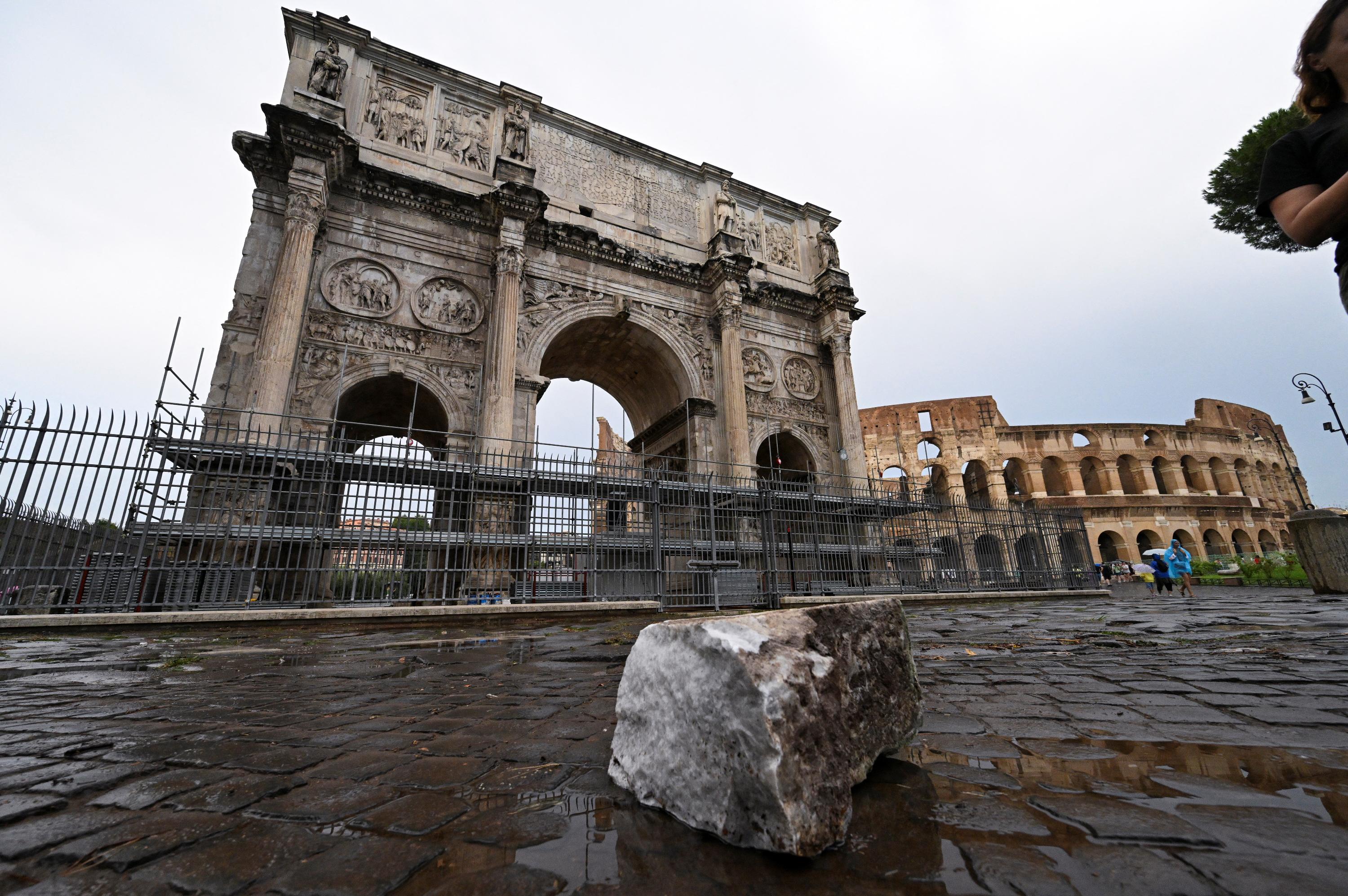 ROME, Sept 3 (Reuters) - The Arch of Constantine, a giant ancient Roman arch next to the Colosseum, was damaged after a violent storm hit Rome, conservation authorities said on Tuesday. In a statement to Reuters, which first reported on the accident, the Colosseum Archaeological Park confirmed that the monument was hit by lightning. The triumphal arch was built in the 4th century AD to celebrate the victory of Constantine - the first Roman emperor to convert to Christianity - over his rival, Maxentius. It is about 25 metres (82 feet) high and is located in the same pedestrian area where the Colosseum stands, a major tourist hotspot. "A lightning strike hit the arch right here and then hit the corner and we saw this fly off," a tourist told Reuters, pointing to a large block of stone fallen to the ground. Reuters video images showed other blocks of stone and rubble lying around the monument, and archaeological park staff working to collect them. "All fragments were recovered and secured. Damage assessments have already begun and the analyses will continue tomorrow morning," the archaeological park said. The arch was hit on its southern side, where pre-scheduled conservation work had started two days ago and which will now also focus on repairing the damage, it added. The accident took place during a heavy thunderstorm that felled trees and branches and flooded several streets of the Italian capital. The Civil Protection agency said 60 millimetres (2.36 inches) of rain fell on central Rome in less than one hour, about as much as would normally fall in a month during autumn. The freak weather was a so-called "downburst", Rome Mayor Roberto Gualtieri said, referring to the kind of severe storm, featuring powerful downward winds, believed to have also caused last month's sinking of British tech tycoon Mike Lynch's yacht off Sicily. "The event that hit Rome is truly unprecedented, because it was so powerful and concentrated in a very short time and in some areas of the city, starting from the historic center," Gualtieri said in a statement. Sign up here. https://www.reuters.com/world/europe/ancient-roman-arch-constantine-damaged-after-violent-storm-2024-09-03/