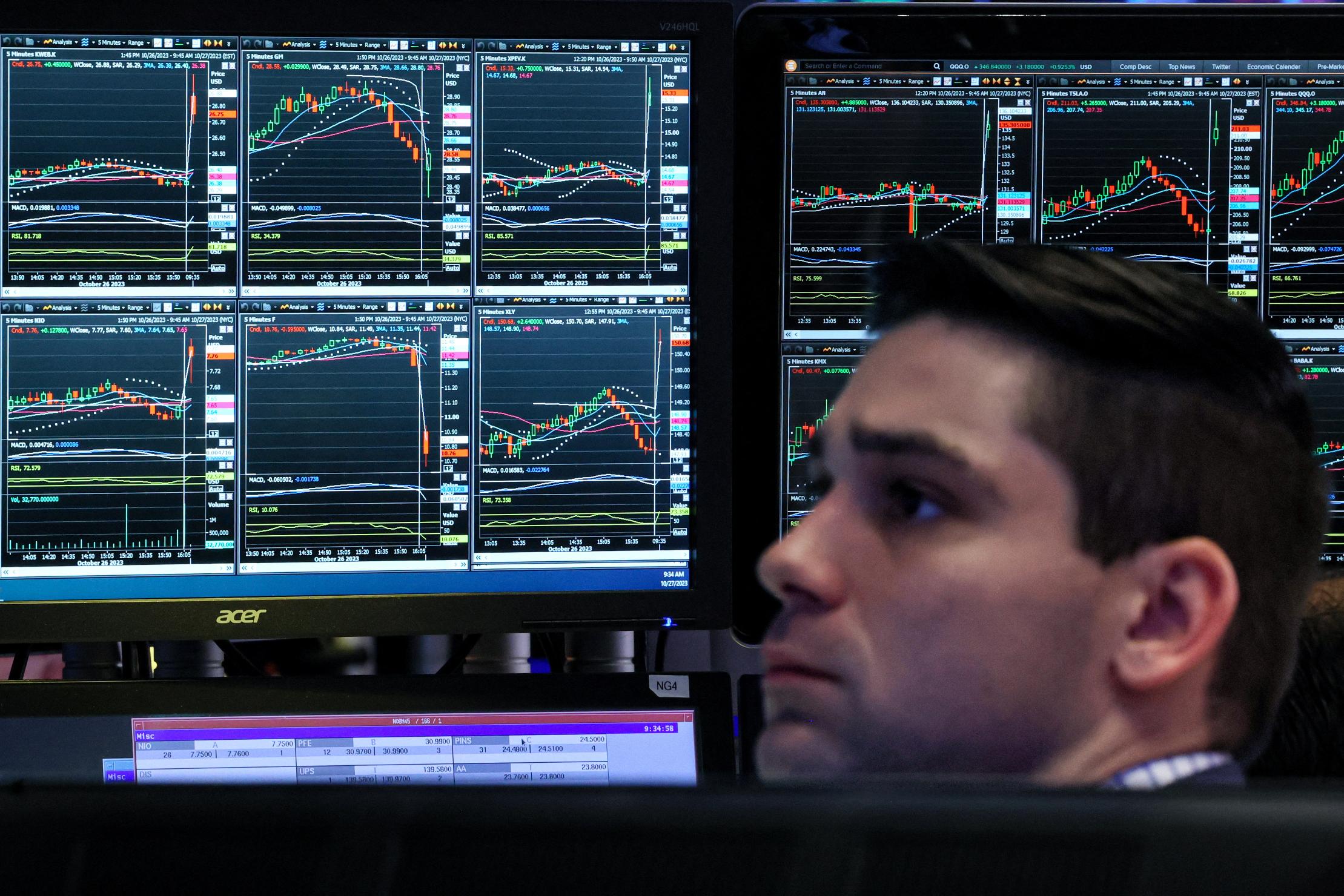 A look at the day ahead in U.S. and global markets from Mike Dolan Another Monday bounce in world markets sets up a Fed-dominated week ahead - although the U.S. central bank may not yet have a great deal to offer stock and bond markets that seem keener to see the glass half empty as October comes to a close. A worrying late-year stock market unwind is starkest in small-cap indexes (.RUT) now tracking year-to-date losses of some 7% - even as the benchmark S&P500 (.SPX) remains up 7% and Big Tech leaders of the Nasdaq 100 are still 30% (.NDX) higher. Tech stocks gained on Friday (.IXIC), for example, even as the Russell 2000 lost more than 1% on the day to hit its lowest since 2020. Even though incoming third-quarter earnings seem like a mixed bag - mainly because of some large individual stock losses due to investors' high bar for 2024 outlooks - the aggregate actually looks quite impressive. Annual earnings growth for S&P500 companies is now expected to have picked up to a 4.3% annual growth rate, according to LSEG estimates, from as low as 1.6% before the reporting season began. And 77% of companies have beaten Wall Street forecasts. A big problem for small firms, however, is that they disproportionately bear the burden of the higher borrowing costs that show little sign of coming down any time soon. The Federal Reserve delivers its latest policy decision on Wednesday and is widely expected to keep rates unchanged for the second straight meeting. Although futures see less than a 50% chance of another rate rise in the cycle, they don't seen a cut coming until June at the earliest. And even though third-quarter U.S. economic growth raced ahead an annualised 4.9%, many now see that too as a high watermark - with GDP models seeing fourth-quarter growth at less than half that rate for now. A key input to that as always will be the state of the labor market, with data this Friday expected to show October payroll growth cooling to 188,000 new jobs from the blowout 336,000 gain last month. And autoworker strikes against Detroit's Big Three car manufacturers could subtract at least 29,000 jobs from October, government data shows. But beyond Fed policy rates, it's the restive bond market and near 16-year-high long-term borrowing costs that are starting to hurt most. As much concern as there is with the slew of new government debt coming down the pike, a key moment this week may well be the Treasury's quarterly refunding plans today and Wednesday. For now at least, market concern about the tense Middle East conflict has allowed some relief. Even though Israel's land invasion of Gaza appears to be under way amid heavy fighting and a dire humanitarian crisis, demands for some aid-related ceasefire are growing. Global bourses and Wall St futures were higher to start the week, with oil and gold prices ebbing a bit - the former now back down 4% year-on-year. Apple (AAPL.O) dominates the week's earnings diary on Thursday. HSBC HSBA.L gained 1.2% in London after reporting a fresh $3 billion share buyback and a more than doubling of third-quarter profit. U.S. 10-year Treasury yields held steady at 4.85% - well below the 5% threshold they breached last week. The dollar (.DXY) was a touch higher, with the Swiss franc ebbing as the Swiss National Bank cut the rate on overnight deposits it pays on commercial bank reserves. The yen was firmer as Japanese government bond yields climbed to fresh 10-year peaks near 0.9% on Monday, with markets weighing the chances of another policy tweak in Tuesday's latest monetary policy decision from the Bank of Japan. In Europe, data showed Germany's economy contracted by a smaller-than-forecast 0.1% in the third quarter but October inflation numbers showed a sharp easing of price pressures. In Hong Kong, a court gave China Evergrande (3333.HK) a five-week reprieve to come up with a deal with creditors or face liquidation after the embattled developer said on Monday it was working on a revised debt-restructuring plan. Key developments that should provide more direction to U.S. markets later on Monday: * Dallas Fed manufacturing survey * U.S. corporate earnings: McDonald's, Loews, Western Digital, FMC, Arista Networks, Welltower, VF, Revvity, Simon Property, Healthpeak, Arch Capital, ON Semiconductor * U.S. Treasury auctions 3-, 6-month bills https://www.reuters.com/markets/global-markets-view-usa-2023-10-30/