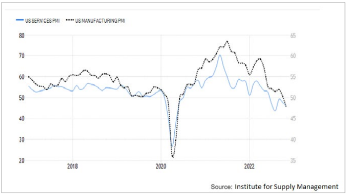 Based on current US economic indicators, inflation declined in the 3rd quarter because price pressures are settling down as demand collapses quickly, according to the business surveys such as the composite manufacturing and services PMI. The PMI readings warn that the US economy is headed straight for recession as higher borrowing costs and the cost-ofliving affect consumers’ spending power, affecting the economic cycle.