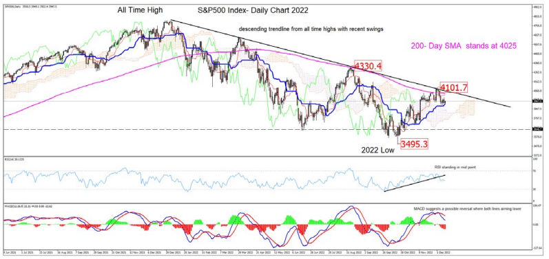 The S&P500 index is trading near the 4,000 level as a 5-day correction pushed it below the 4,100 high seen on December 1, 2022. The correction is a product of the 200 SMA playing its role as a robust dynamic resistance level. The index could not defeat the moving average and generated a perfect lower swing high. As you can see in the chart below, there is a descending trendline from the all-time highs, with the recent swing highs confirming the bearish bias. However, the Ichimoku Kinko Hyo indicator justified the recent upside move when prices moved past the bearish cloud and beyond the kijun-sin line at 3,900. Nonetheless, the S&P 500 retreated from recent highs, and now the RSI is pointing south while at the midpoint. Furthermore, the MACD confirmed a possible price reversal to the downside, with both lines threatening to break below 0 mid-line.