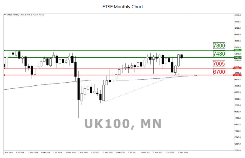 Technically, on the monthly chart, the FTSE 100 fell strongly from the 7,649 resistance level due to continued interest rate hikes that put pressure on public company profits and profit margins.