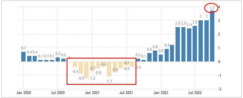 In 2020 and 2021, Japan’s CPI growth rate repeatedly fell to a negative range, reaching a low of -1.2%. In 2022, affected by the rising international energy prices, inflation improved, but no negative growth rate showed up. However, high inflation in the US, the European Union, and the UK has reached an inflection point. Japan’s inflation rate is expected to echo that and decline accordingly. Provided that in 2023, international oil prices fall more than expected, Japan’s inflation rate may fall into negative territory again.