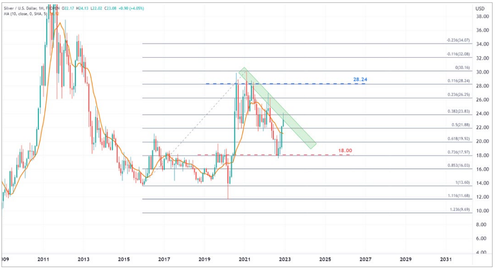 According to the monthly chart, spot silver prices are trying to move closer to the upper side of the descending channel, with the $24 mark possibly serving as resistance. If the level is smashed thanks to the favourable fundamentals mentioned above, silver prices will test $26.25, with the next critical resistance being $28.24. On the support front, the 10-day moving average may exceed $18 if the preliminary support is breached, entering the active trading range from August 2019 to February 2020.