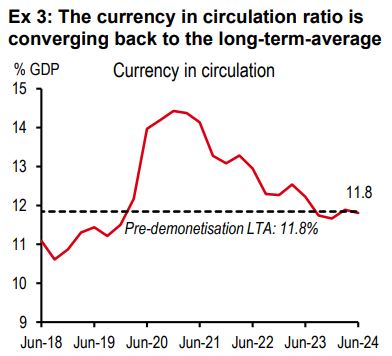 Is currency leakage hurting banking sector liquidity? Again, no. Because, as a percentage of GDP, currency in circulation has been declining back to pre-pandemic and pre-demonetisation levels (see Exhibit 3).