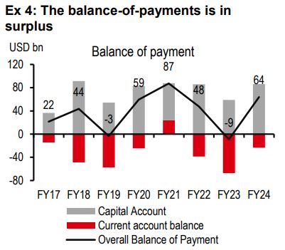 Is weaker foreign equity ownership leading to deposit outflow? Not at all. True that the ownership share of foreigners in India’s equity markets has fallen, while domestic participation has grown. However, when we add up all the engagement India has with the rest of the world, across exports, imports, capital inflows and outflows, which is well captured by the balance of payments, we find it to be in surplus, and a growing surplus at that (from USD48bn in FY22 to USD64bn in FY24; see Exhibit 4), courtesy of strong services exports and portfolio debt inflows.