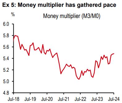 And here, the money multiplier (calculated as M3/M0) can’t explain the weakness. Rather, the multiplier has gathered pace compared to the pre-pandemic period (see Exhibit 5). This is consistent with the strong credit growth over this period.
