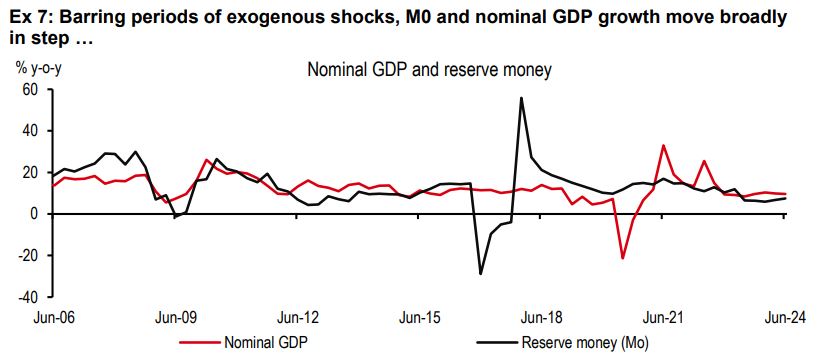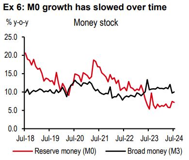 So then, the weakness in deposits must come from the weakness in M0, which the central bank creates. And, indeed, it is clear that M0 growth has slowed over time (see Exhibit 6).
