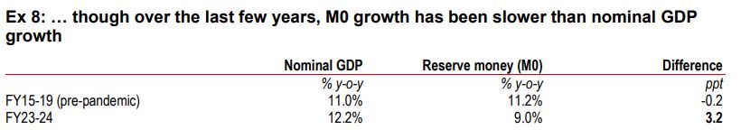 - An element of discretion. The RBI can choose to keep liquidity tight/loose to help with its objectives like inflation management, financial stability, etc. And, indeed, we find that over the last two years, the RBI has preferred tighter policy (more on this later). M0 growth has been running a shade lower than nominal GDP growth (see Exhibit 8).