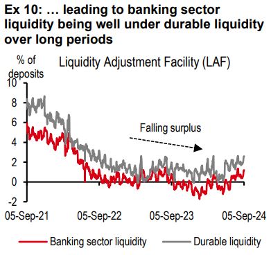 This has changed the government’s spending schedule; much of the spending now happens later in the year. And, while the money eventually gets spent, it first remains locked up for several months in a row (see Exhibit 9). This is clearly visible in the large gap between banking sector liquidity and core banking sector liquidity (which includes government balances at the RBI; see Exhibit 10).