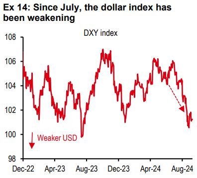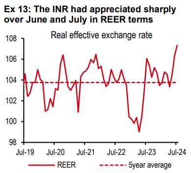 - The dollar has weakened in recent weeks, providing much needed breathing space to emerging market economies. India, for now, seems to be using this opportunity to accumulate foreign exchange reserves (with foreign currency assets having risen by USD30bn since June), perhaps in a bid to reverse the sharp REER appreciation over June and July (see Exhibit 13 and Exhibit 14).