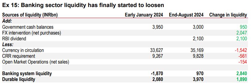 And, relatedly, banking sector liquidity has perked up in recent weeks, leading to market rates at the short end softening by 25bp (see Exhibit 10 above and Exhibit 15).