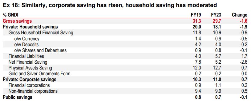 On the deposit side, there is a noticeable rise in corporate deposits and a fall in household deposits (see Exhibit 17). This maps well with India’s saving data, whereby corporate saving is above pre-pandemic levels, driven by strong profitability in certain sectors, while net household saving is lower than before (see Exhibit 18).