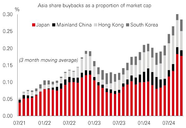 A key difference in Asia is that buybacks have been driven by regional efforts to improve corporate governance. Governments have called on firms to be more investor-friendly and improve their valuations. Japan is a prime example, and is now seeing a third consecutive year of record buybacks in 2024. A similar move in South Korea – the ‘Value-Up’ programme – saw a 25% rise in buybacks in H1-24 from H1-23. Mainland Chinese authorities have also demanded action on profitability and shareholder returns. Share repurchases there are on course to break domestic records this year, with September’s stimulus measures including a RMB300bn relending facility earmarked specifically for share buybacks. With Asian markets on undemanding valuations, further progress on corporate reforms and share buybacks could provide upside.