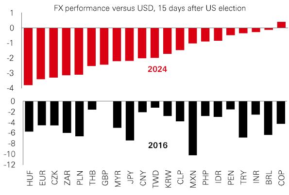 Moves in Europe have also been quite different. The euro and some Eastern European currencies have been badly hit by the election result. Trade tariffs would come at a very difficult time for the region’s manufacturers. But the good news is FX weakness supports external competitiveness for export-dependent firms. In 2025, US-specific factors – policy and inflation trends – are likely to be a big influence on the dollar. But global economic and political developments will also be key.