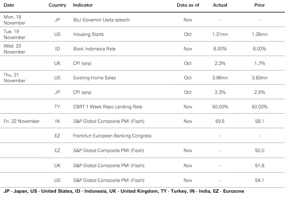 Risk markets were resilient despite heightened geopolitical tensions, with both oil and gold prices rallying. The US DXY dollar index paused for breath after its recent strong run. Core government bonds consolidated ahead of key US inflation data and mixed comments from Fed officials. US equities saw a broad-based rally as investors digested Q3 earnings. The Euro Stoxx index fell modestly, while Japan’s Nikkei 225 weakened as the yen rebounded versus the US dollar. BoJ governor Ueda reiterated his commitment to gradual rate hikes. Emerging market stock markets were mixed. The Shanghai Composite and Hang Seng indices finished the week lower, but the tech-driven South Korea Kospi index performed well. India’s Sensex index fell further. In Latin America, Brazil’s Bovespa and Mexico’s IPC equity indices were on the defensive. Meanwhile, copper was little changed.