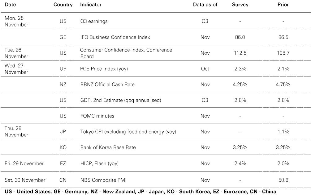 - With Q3 earnings season drawing to a close in the US, last week saw results from the market’s most closely watched technology giant, Nvidia. It’s quarterly profits were ahead of analyst forecasts for the quarter. Indeed, with more than 90% of companies in the index having reported, around 75% of them have beaten profit expectations.