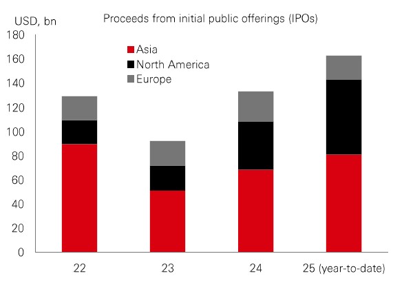 In terms of money raised, Asia’s market for initial public offerings (IPOs) has been a world-beater, with USD81 billion raised year-to-date. That’s already an increase of nearly 60% on 2023. Industry data suggest that Q3 was particularly strong for IPOs, given fading tariff concerns and Fed rate cuts. Hong Kong, in particular, has reclaimed its position as a major hub for new listings, helped by supportive policy on dual-listings and fast track channels to attract tech firms. Mainland China’s onshore market has also thrived, and so have other ASEAN hubs. India also stands out, where there has been a boom in new listings across sectors, and strong retail demand.