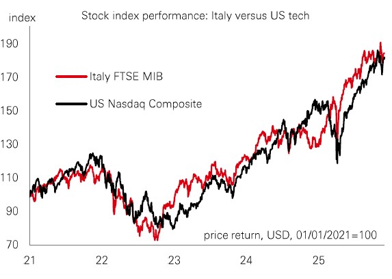 However, the same cannot be said of its equity market performance. Despite all the hype surrounding tech and AI, Italy's FTSE-MIB has quietly outperformed the US Nasdaq year-to-date. This is not a one-off – since the start of 2021, Italian stocks have matched US tech sector gains. The drivers behind this are largely rooted in sector composition, with Italy's FTSE MIB dominated by banks, energy, and industrial cyclicals, all of which were relative winners in a regime of higher interest rates and inflation, and commodity price volatility. Lower government bond spreads have also contributed to boosting stock multiples.