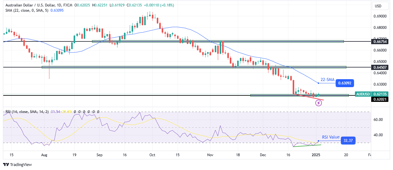 On the technical side, the AUD/USD price has steadied near the 0.6202 support level. After a sharp fall, bears are showing some exhaustion at this level. The price has maintained a bearish trend since it broke below the 22-SMA, making lower highs and lows. This pattern has remained for long, allowing AUD/USD to break below major support levels.