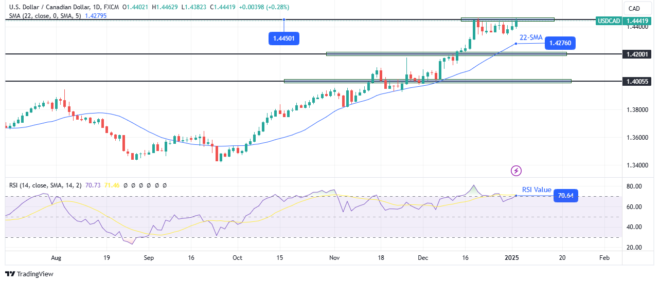 On the technical side, the USD/CAD price has paused its uptrend at the 1.4450 resistance level. The bullish bias is strong since the price trades above the 22-SMA with the RSI in the overbought region.