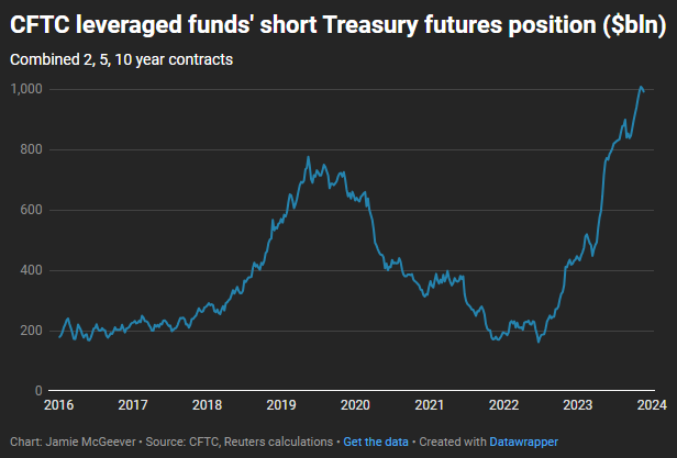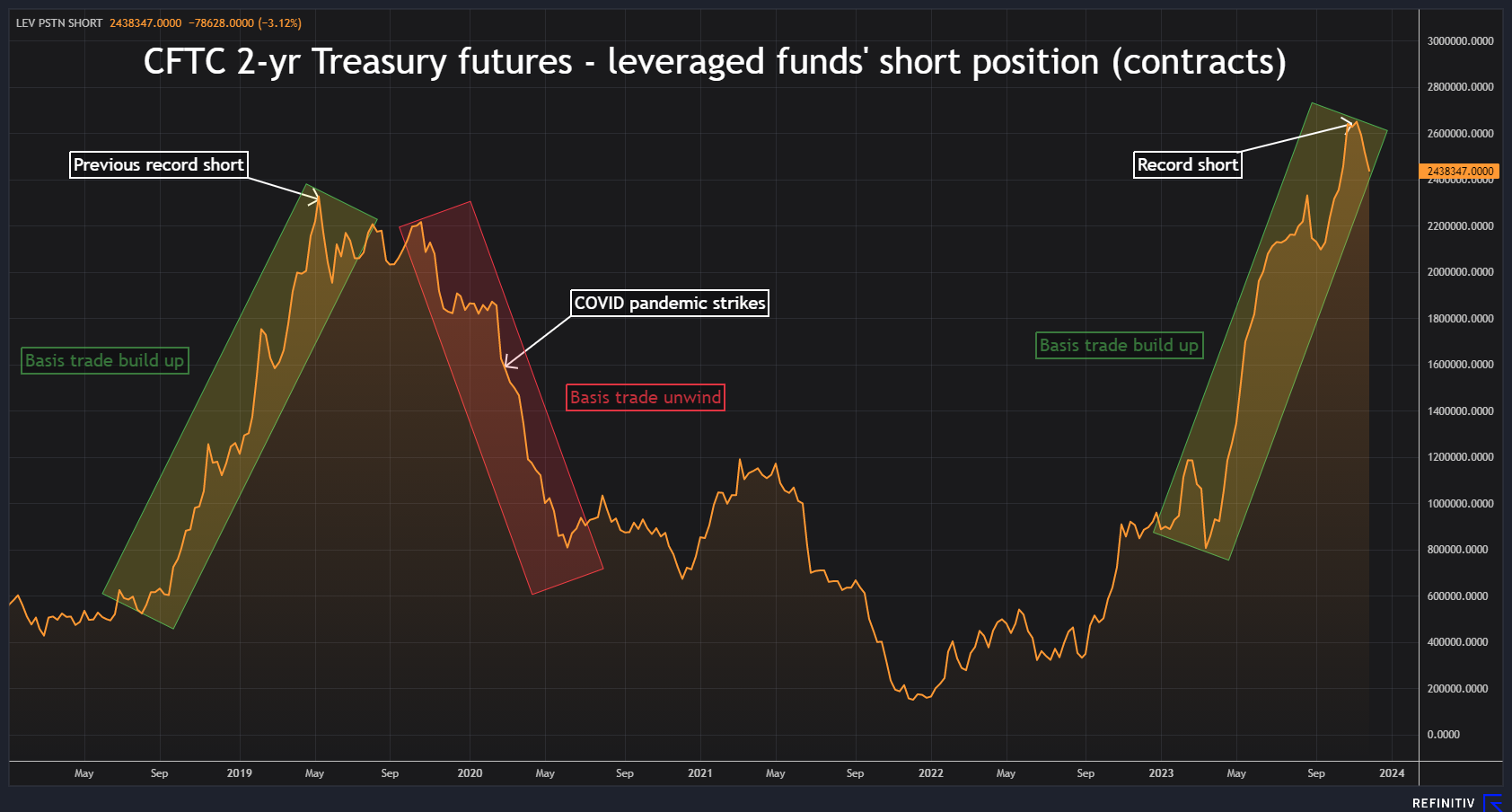 Commodity Futures Trading Commission data show that the aggregate short position in Treasury futures held by leveraged accounts, the hedge funds most involved in the basis trade, recently reached record levels.