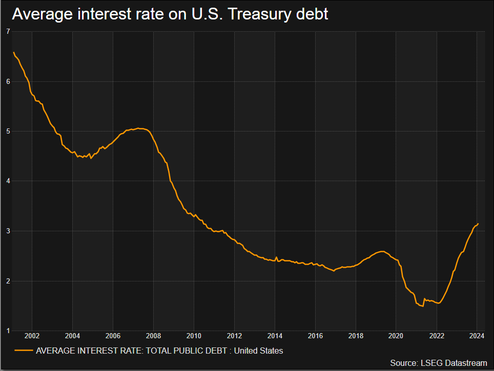 The average interest rate being paid on the $34 trillion of outstanding U.S. public debt is rising, and has just gone above 3%. However, that is still historically low, and well below recent and current nominal GDP growth rates of over 5%.