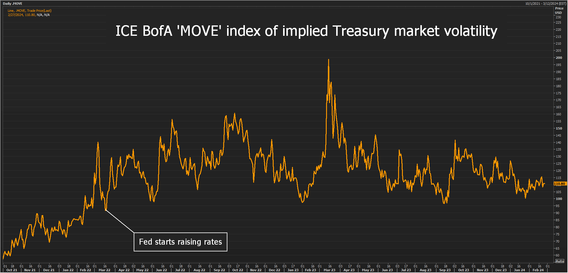 Since the Fed first raised rates two years ago, Treasury market volatility has rarely been lower - partly because inflation has cooled and is now near target, but probably also in part due to a 'stronger for longer' economy.