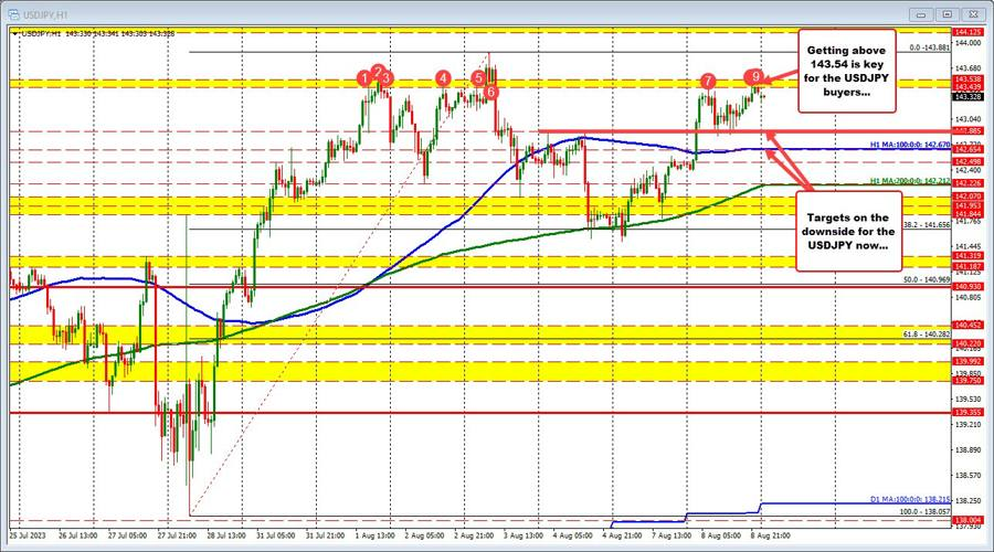 For sellers, if the price does rotate to the downside getting and staying below 142.88 would give them more confidence with the 100 hour moving as 142.67 another key target.