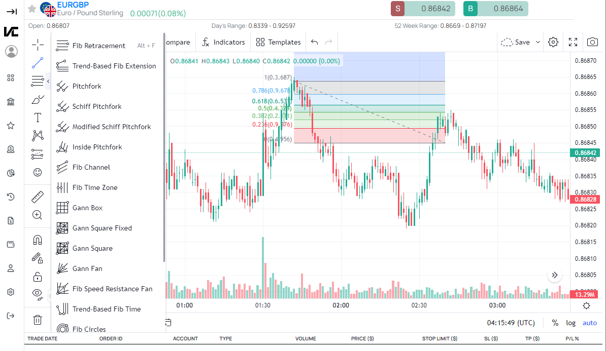 Draw the Fibonacci Levels: Draw the Fibonacci retracement levels on the chart using the selected swing points. The most common levels are 38.2%, 50%, and 61.8%. These levels indicate potential support and resistance areas where the price may reverse or continue its trend. You can also include additional levels such as 23.6% and 78.6% for more reference points.