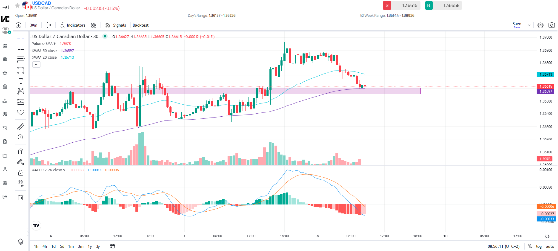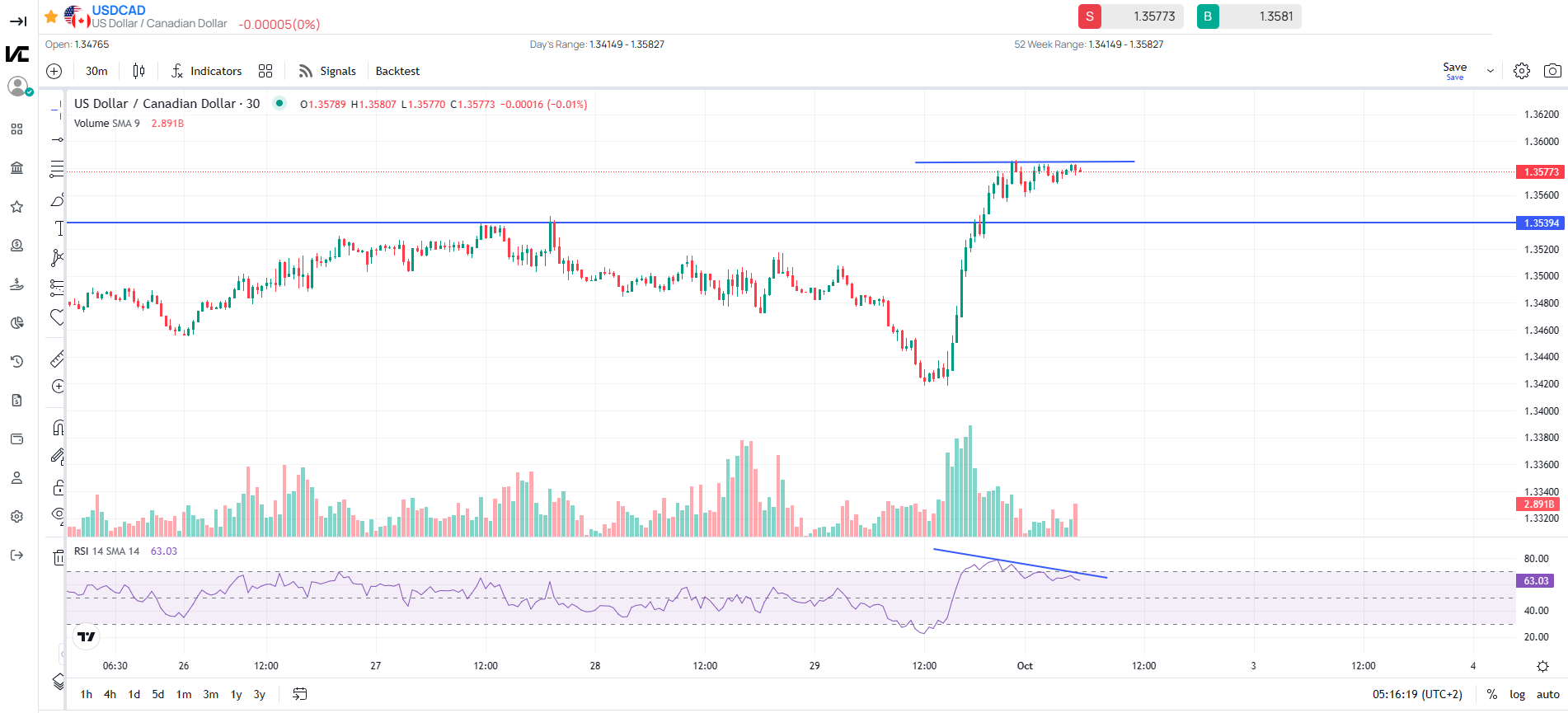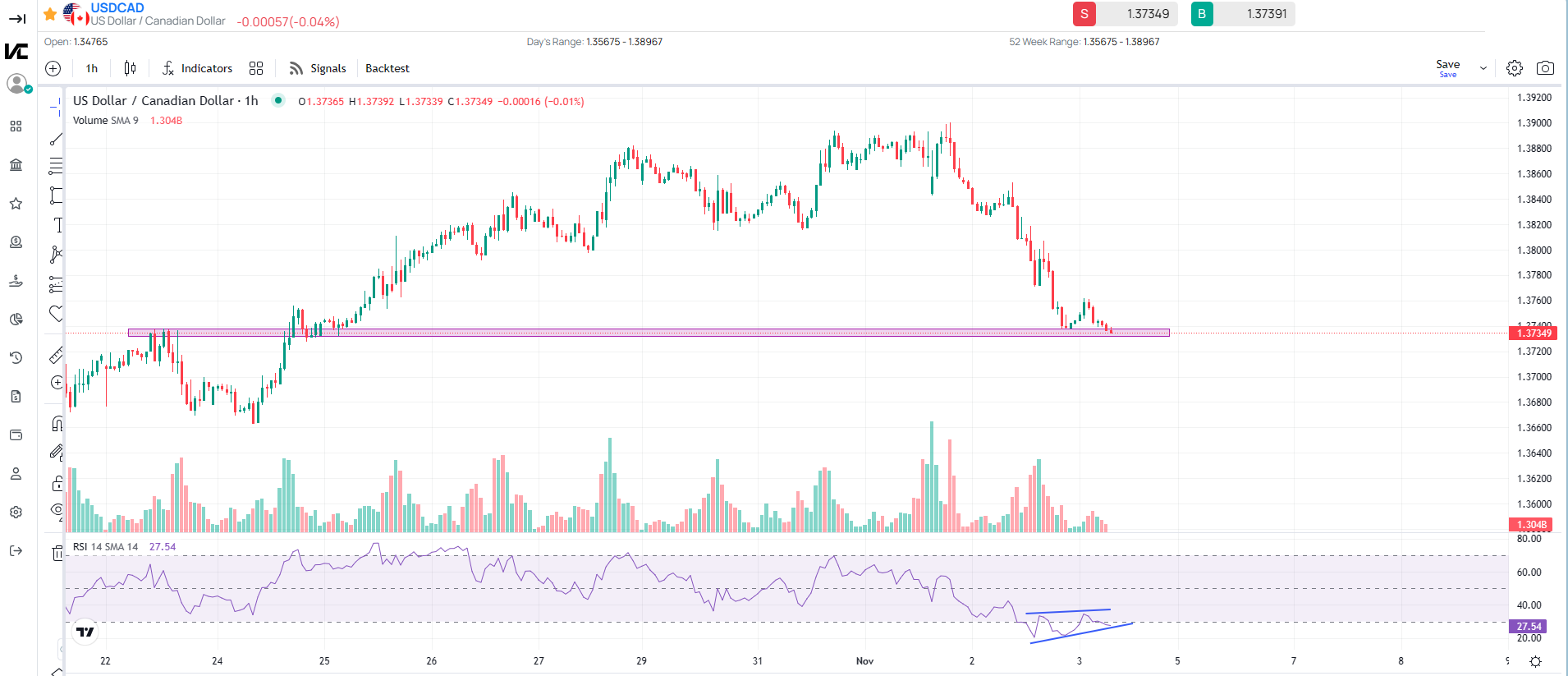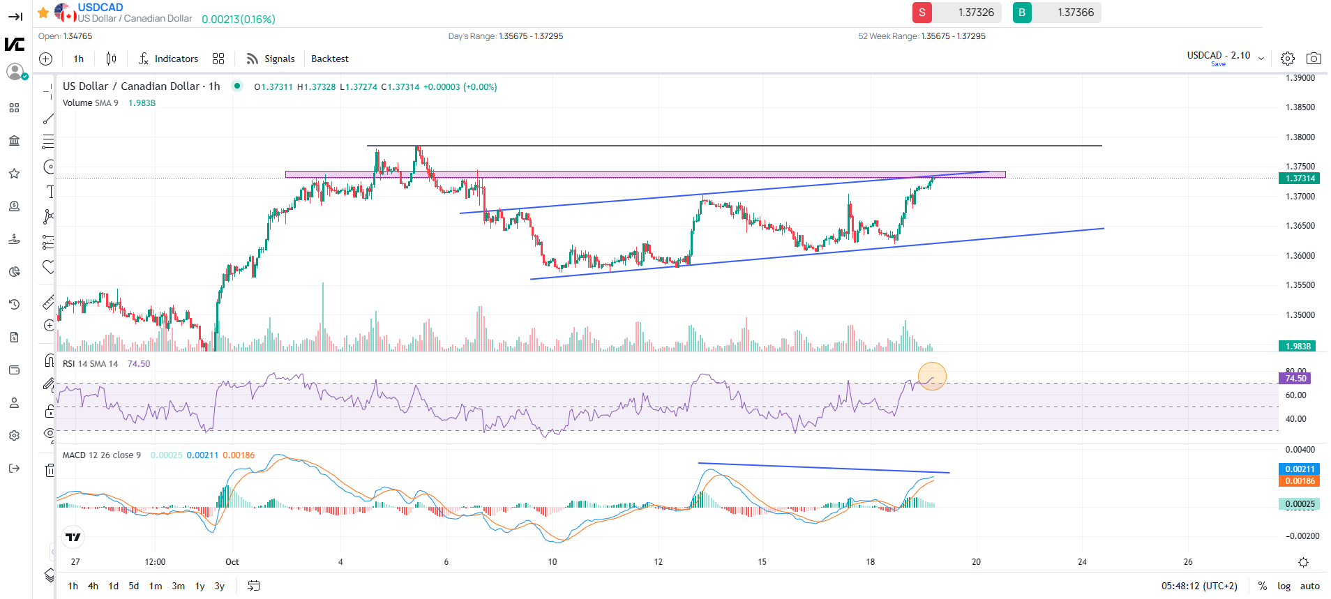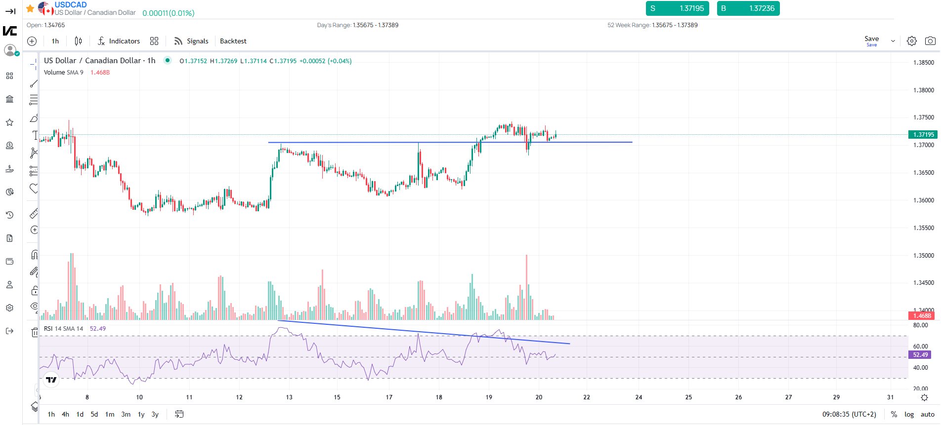 The USDCAD currency pair has reached a critical support level at 1.37321 to 1.37379, with RSI indicator showing a bullish divergence. This suggests that the selling momentum for the currency pair is slowing. Traders may look out for potential buying opportunities. However, if the price breaks below the support level, traders may look for selling opportunities instead.